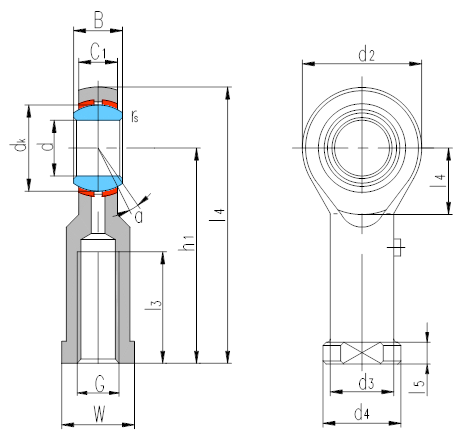 軸 承 型 號 Bearing number 外 形 尺 寸 Dimensions mm 額定載荷 Load ratings kN 重量 Weight ≈kg d B dK C1 max d2 G 6H h1 l3 min l4 l5 l7 W d3 d4 rs min α? ≈ 動載荷 Dynamic 靜載荷 Static SIBP5S1) 5 8 11.112 6 16 M5 27 14 35 4 8 9 9 11 0.3 13 3.3 4.1 0.016 SIBP6S1) 6 9 12.7 6.75 18 M6 30 14 39 5 9 11 10 13 0.3 13 4.3 5.3 0.026 SIBP8S 8 12 15.88 9 22 M8 36 17 47 5 11 14 12.5 16 0.3 14 6.8 8.5 0.044 SIBP10S 10 14 19.05 10.5 26 M10 43 21 56 6.5 13 17 15 19 0.3 14 10 11 0.072 SIBP10S/B1 M10×1.25 SIBP12S 12 16 22.23 12 30 M12 50 24 65 6.5 15 19 17.5 22 0.3 13 13 14 0.108 SIBP12S/B2 M12×1.25 SIBP14S 14 19 25.4 13.5 34 M14 57 27 74 8 16 22 20 25 0.3 16 17 20 0.161 SIBP14S/B1 M14×1.5 SIBP16S 16 21 28.58 15 38 M16 64 33 83 8 17.5 22 22 27 0.3 15 21 25 0.225 SIBP16S/B1 M16×1.5 SIBP18S 18 23 31.75 16.5 42 M18×1.5 71 36 92 10 19.5 27 25 31 0.6 15 26 30 0.295 SIBP20S 20 25 34.93 18 46 M20×1.5 77 40 100 10 21.5 30 27.5 34 0.6 15 31 35 0.382 SIBP22S 22 28 38.1 20 50 M22×1.5 84 43 109 12 23 32 30 37 0.6 15 38 43 0.488 SIBP25S 25 31 42.86 22 60 M24×2 94 48 124 12 29.5 36 33.5 42 0.6 15 47 65 0.749 SIBP28S 28 35 47.63 25 66 M27×2 103 53 136 12 32.5 41 37 46 0.6 15 59 77 0.949 SIBP30S 30 37 50.8 25 70 M30×2 110 56 145 15 34 41 40 50 0.6 17 63 86 1.13
