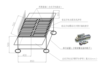 * 1.44車廂臺面裝有滾軸,左右方向(牽引方向為前后方向)滾動,左右方向設(shè)計有方便開合的防護(hù)欄,方便裝卸貨。