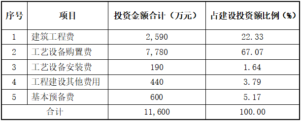 項(xiàng)目總投資15,500萬(wàn)元,其中:建筑工程費(fèi)2,590萬(wàn)元,工藝設(shè)備購(gòu)置費(fèi)7,780萬(wàn)元,工藝設(shè)備安裝費(fèi)190萬(wàn)元,工程建設(shè)其他費(fèi)用440萬(wàn)元,基本預(yù)備費(fèi)600萬(wàn)元,鋪底流動(dòng)資金3,900萬(wàn)元。