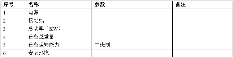 2.4設(shè)備其他技術(shù)指標(biāo):(需含設(shè)備總功率、電壓、電流、接口、環(huán)境溫度、場(chǎng)地等安裝環(huán)境有關(guān)要求)
