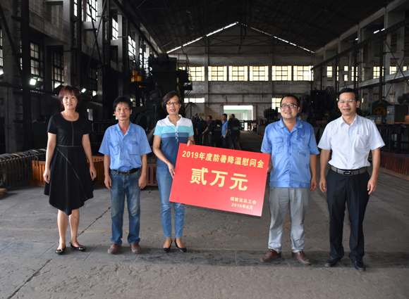 2019年8月14日下午,福建省總工會副巡視員劉冰新及漳州市總工會副主席陳美燕率防暑降溫慰問團一行蒞臨公司藍田一廠區生產現場,看望慰問一線員工。公司黨委書記、董事長曾凡沛,黨委副書記、工會主席康安偉接待了慰問團一行。