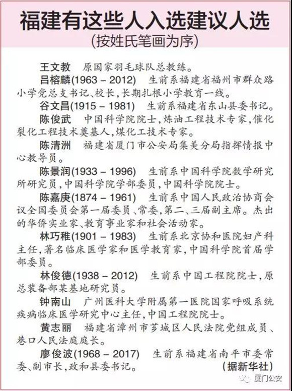 ????在前期的遴選推薦、群眾網上投票、組委會集中審議、中央和國家機關有關部門認真審核下,組委會于9月15日公示了300名“最美奮斗者”建議人選名單。其中,“時代楷模”、全國公安系統一級英模、廈門市公安局民警陳清洲和漳州市薌城區人民法院黨組成員、巷口人民法庭庭長黃志麗榜上有名。同時,福建共有12人入選建議人選名單。