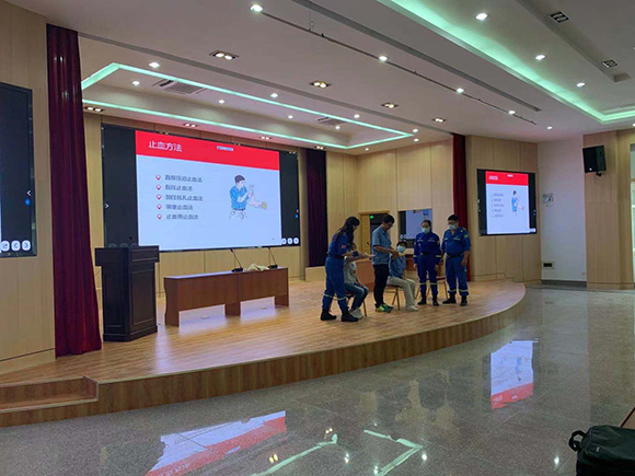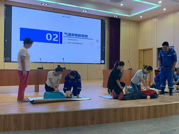 在急救技能實操部分,教官重點演示了心肺復蘇技術、海姆立克急救法、外傷包扎技術等日常實用的急救技術,并現場邀請參與培訓的員工上臺參與實操。公司員工踴躍參與,教官細心指導,及時糾正員工的錯誤動作,現場氣氛活躍。